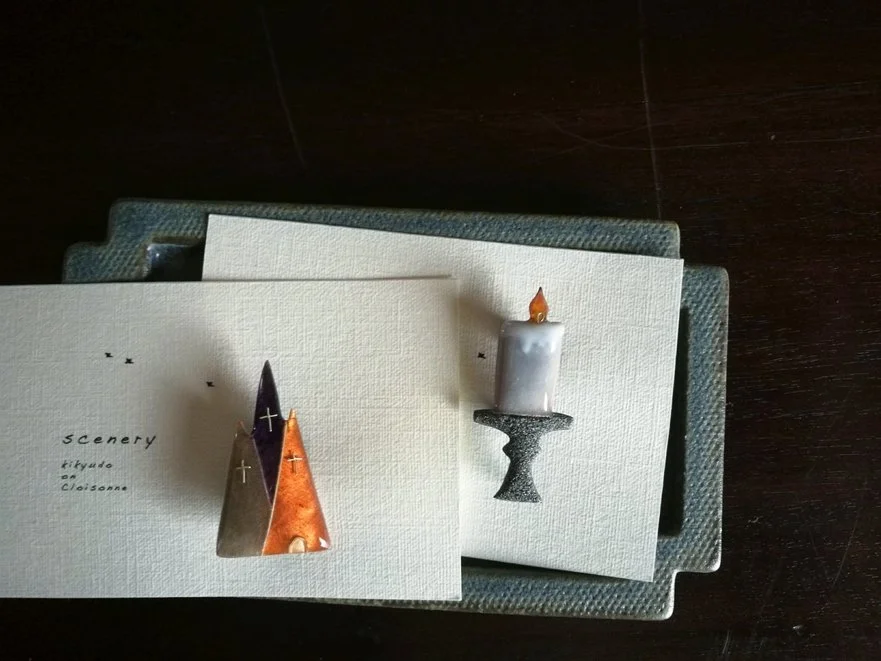 カットした銅板に、銀線や真鍮線でデザインを描きながら、ガラス質の釉薬をのせて、約800℃の炉で何度も焼成して、色と輝きを重ねていきます