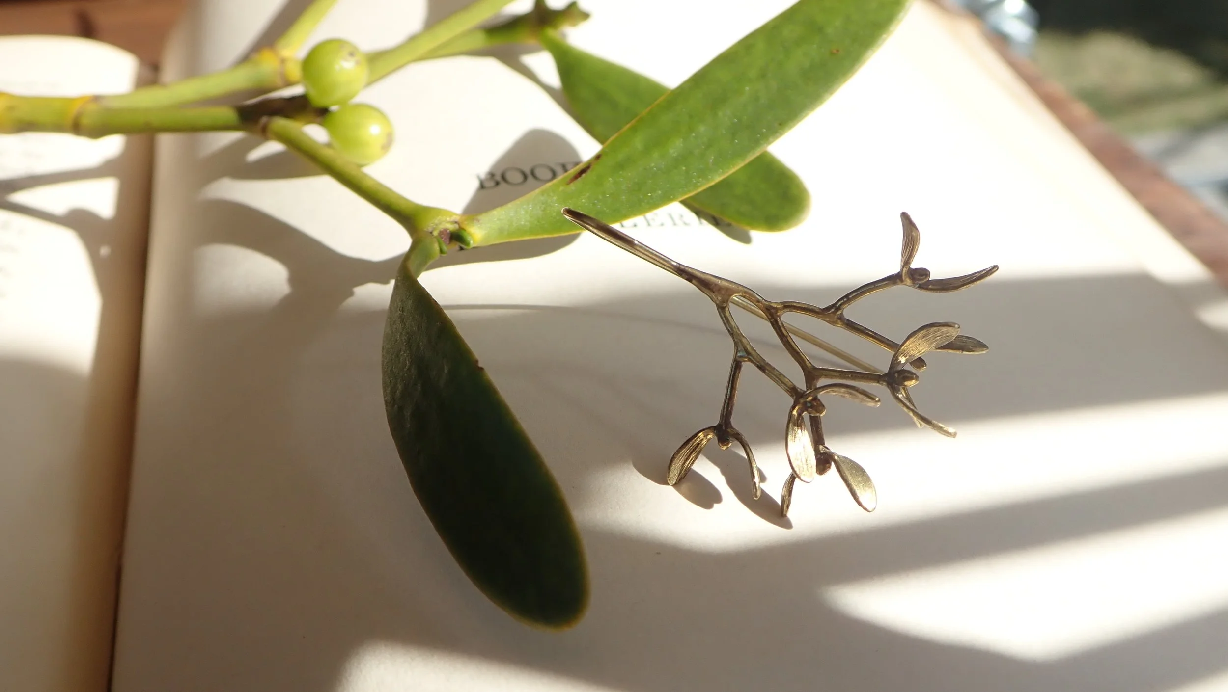 Mi-Mistletoe(ミミヤドリギ)シリーズです。妖精が舞うように葉の印象を変え、一枚一枚丁寧にテクスチャーをつけています。ヤドリギといえばクリスマスの植物のイメージですが実際は常緑の半寄生植物です。このミミヤドリギも耳から養分を吸い、自身も宿主も輝かせる、ダークファンタジーのようなエピソードがあるモチーフです。繁殖方法は宿主による"おすすめ"です。ユビヤドリギという仲間もいます。