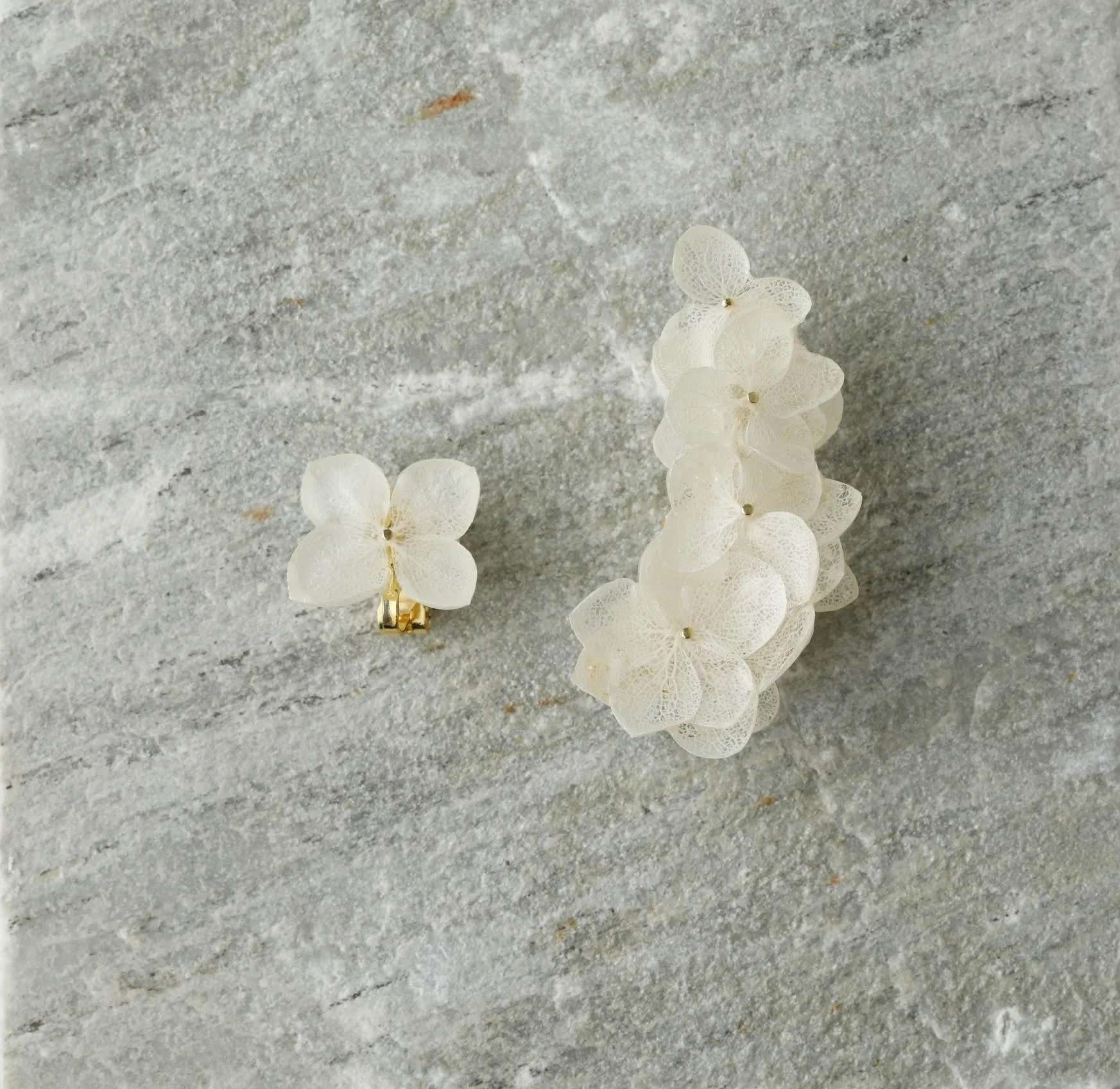プリザーブド加工をされた本物のお花を、樹脂でコーティングし作製しています。本物のお花の良さが生きるようできるだけ立体的に、またビジューなどの装飾は最小限にし、シンプルなデザインを心掛けています。